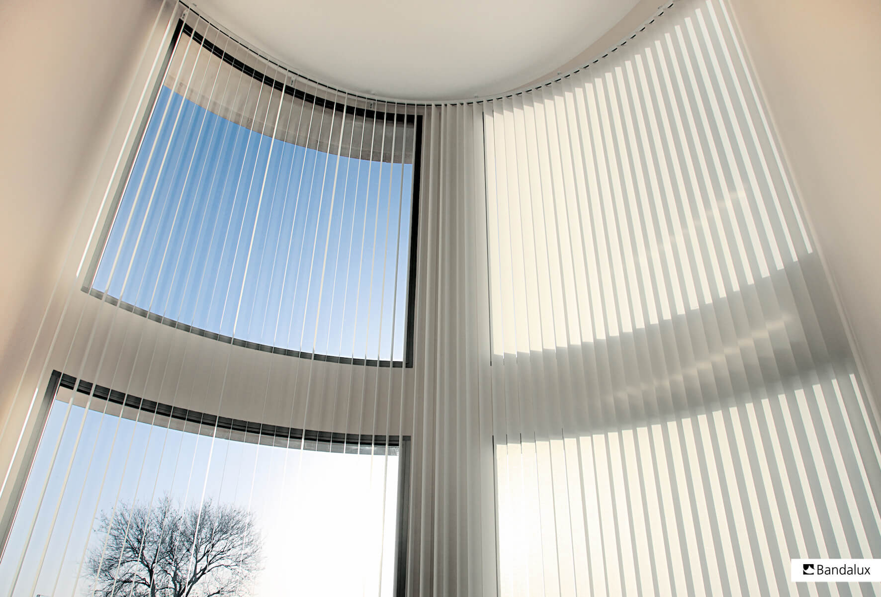 Le store à bandes verticales s'adapte à toutes les fenêtres et tous les espaces grâce à l'inclinaison du rail à son cintrage. Les découpes des bandes permettent une installation dans des escaliers, plafonds inclinés, dans des courbes ou des espaces de forme particulière.